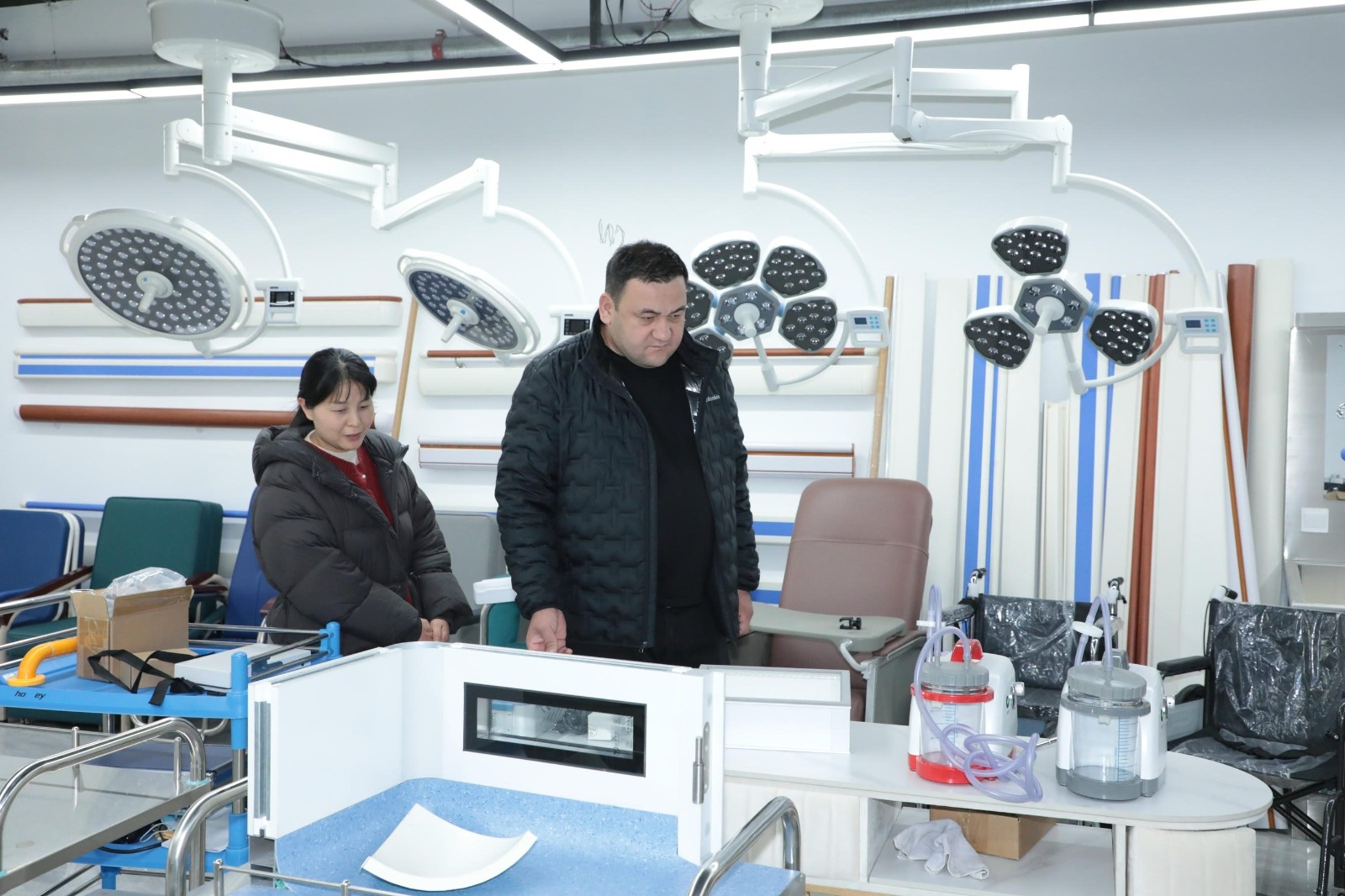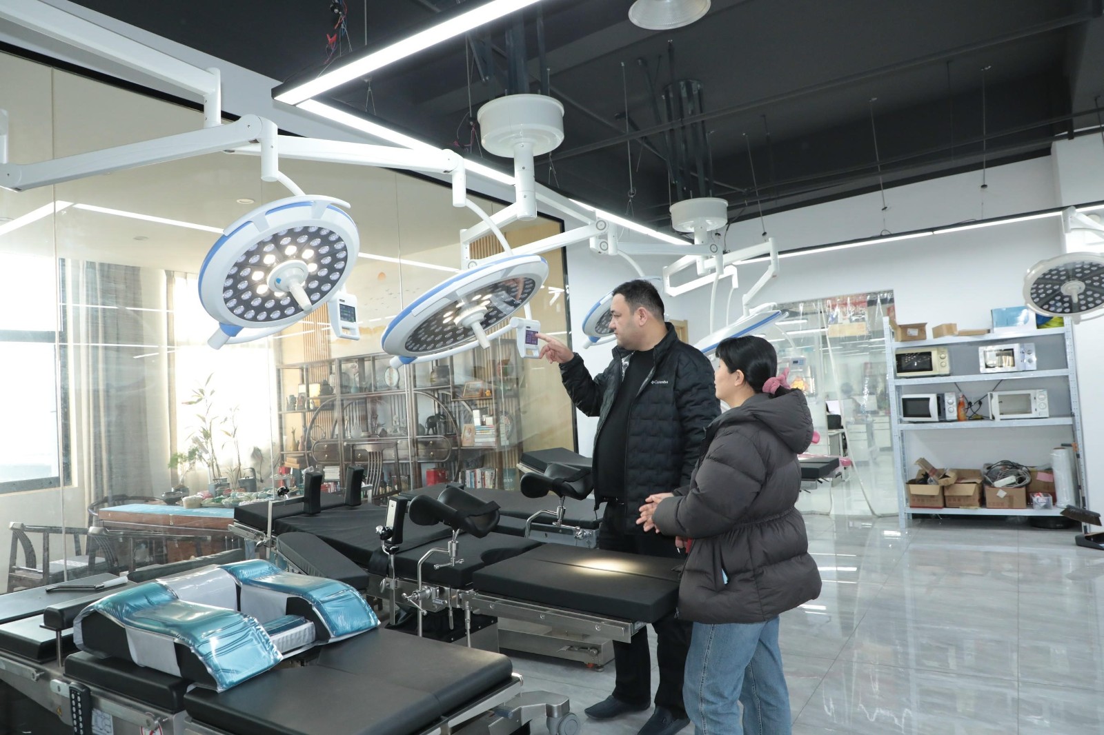 During the visit, the client reviewed different models of surgical lights, including brightness, adjustment options and typical use in general theatres, and discussed the structure, height and position adjustments of operating tables, as well as their compatibility with other OR equipment. Both sides exchanged initial ideas on model selection and configuration according to project needs.